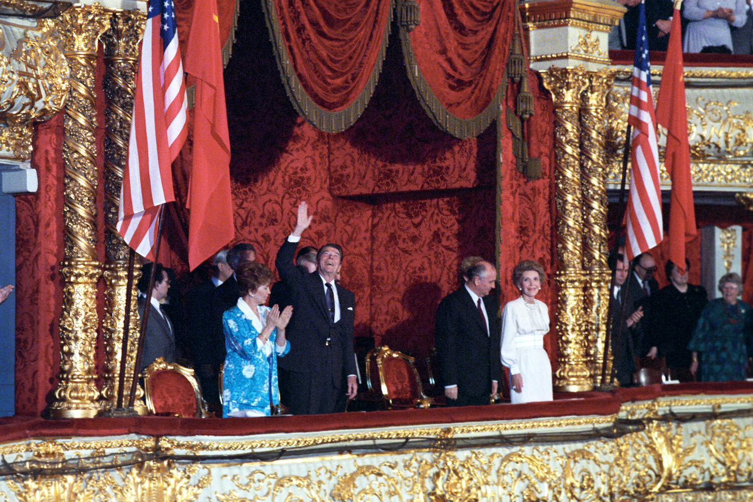 Президент США Рональд Рейган с супругой и Генеральный секретарь ЦК КПСС Михаил Горбачев с супругой на вечере балета в Большом театре, 1988 год