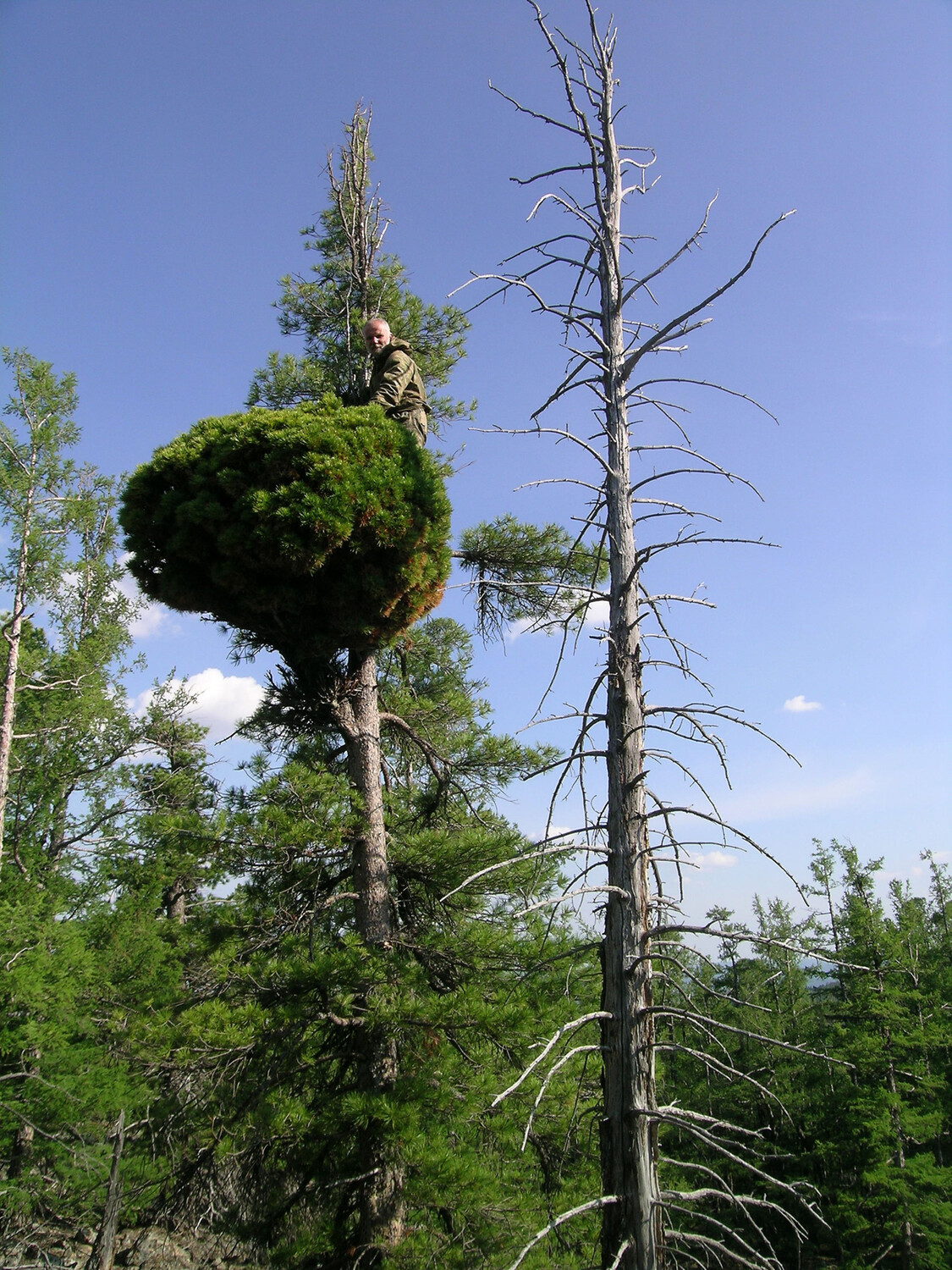 Много лет назад он заинтересовался кедровыми деревьями с необычными ветками, — так называемыми ведьмиными метлами, — которые иногда встречаются у кедра и других древесных видов. Это густое пугающее скопление веток, которое выглядит как аномалия и издалека действительно напоминает ведьмину метлу.