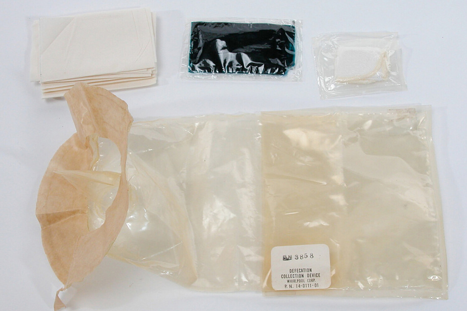 На корабле «Аполлон» вакуумной системы не было, и потому справление нужды во время полетов на Луну было сопряжено с большими трудностями. Вместо нее астронавты использовали пакеты с клейким краем, которые приклеивались к телу. Со сбором мочи больших проблем не возникало, зато дефекация была сущим кошмаром. После нее испражнения необходимо было перемешать с антисептиком для предотвращения образования газов и запечатать, но герметичности удавалось достичь с большим трудом.