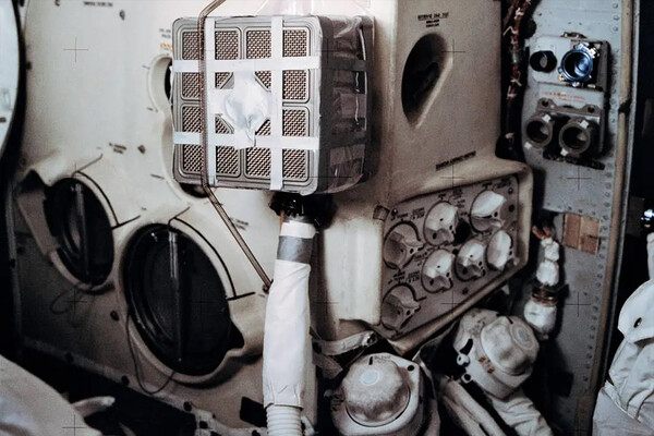 После маневра актуальной стала следующая беда. Запасов кислорода «Водолея» хватало для дыхания на обратную дорогу, но патроны гидроксида лития для поглощения углекислого газа были рассчитаны лишь на двух астронавтов на 45 часов. Запасов «Одиссея» должно было хватить, но его патроны нельзя было подключить к лунному модулю из-за разницы в размере и формате. Поэтому инженеры NASA на ходу придумали импровизированный регенератор воздуха, собранный из пластиковых обложек руководств по эксплуатации, скотча и подручных предметов. Спустя пару часов система, за свой внешний вид названная «почтовым ящиком», заработала, и уровень углекислоты начал падать.