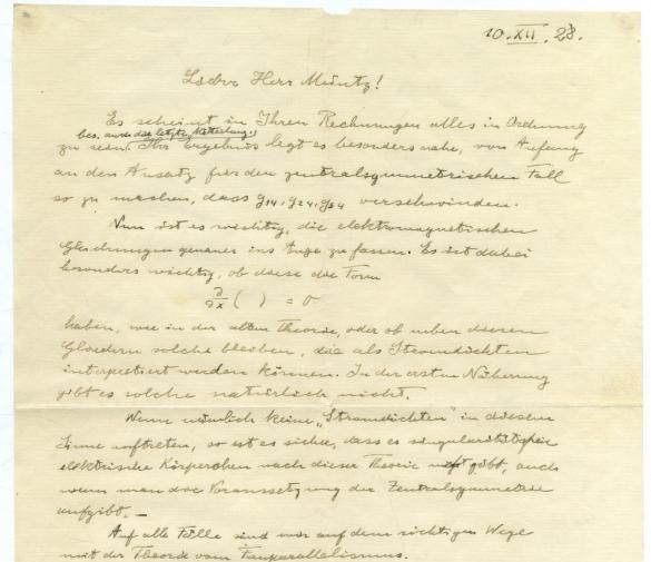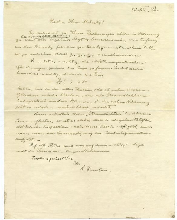 Письмо было написано в «наиболее захватывающий, волнующий период научной карьеры Эйнштейна», отмечается на сайте аукциона. Отправленное в 1928 году из Берлина письмо было посвящено теории относительности и адресовано математику Герману Мюнцу. В письме Эйнштейн описал финальные этапы развития теории. Также к письму был приложен конверт, в котором оно было отправлено.