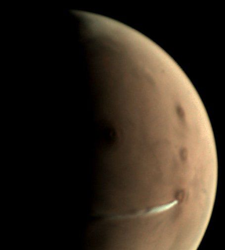 На снимке, сделанном 10 октября, облако простирается на расстояние порядка 1500 километров к западу от вулкана, при этом диаметр самого вулкана составляет всего 250 километров. По словам ученых, длина облака меняется в течение марсианского дня, возрастая утром и достигая максимума, когда облако можно видеть даже с помощью наземных телескопов.