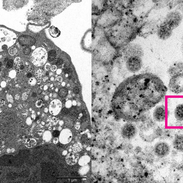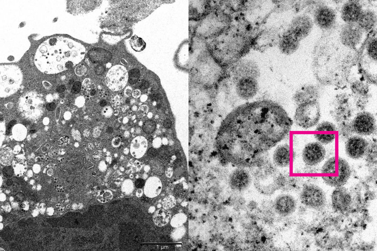 По словам авторов, на неувеличенном изображении видны поврежденные клетки с набухшими везикулами, в которых содержится вирус — маленькие черные частицы, на подробном — шарообразные вирусы с шипами, напоминающими зубцы короны.