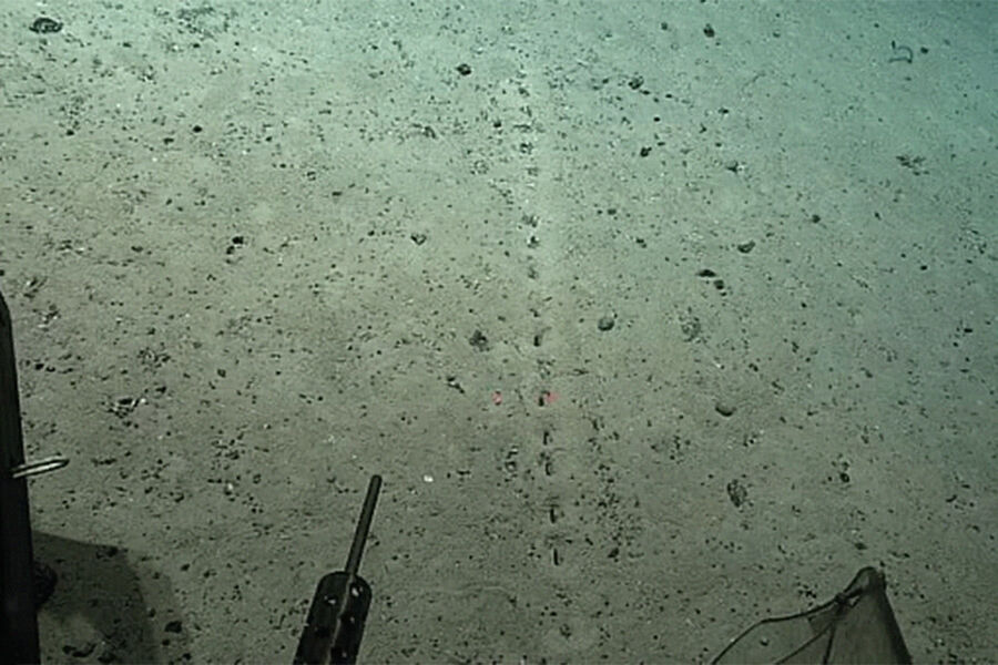 На момент съемки аппарат находился на глубине чуть больше четырех километров. На изображении виден ряд небольших отверстий, расположенных на почти идеальной прямой линии. У ученых нет ответа, что могло их породить. «Хотя они выглядят почти как рукотворные, из-за маленьких кучек породы вокруг отверстий кажется, что их выкопало… что-то», — прокомментировали фотографию ученые.