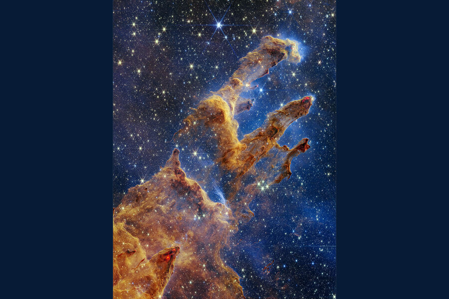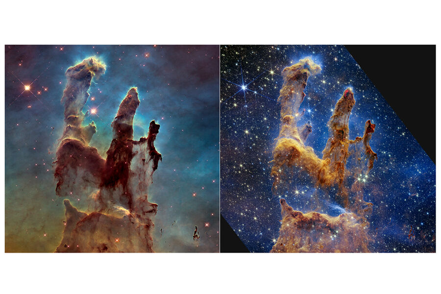 Новое изображение «Столпов» получено в ближнем инфракрасном диапазоне при помощи инструмента NIRCam космической обсерватории James Webb. На нем, в отличие от оптического изображения, стали четко видны ранее скрытые плотные небольшие облака, где находятся красноватые протозвезды, а также сверхзвуковые струи и ударные волны. Особенно хорошо заметна разница при сравнении двух фотографий.