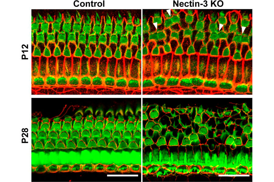 Выяснилось, что у таких мышей развивается частичная глухота, несмотря на то, что общее количество волосковых клеток в их кортиевых органах при рождении была одинакова. Тогда ученые провели вскрытие мышей месячного возраста и выяснили, что примерно половина волосковых клеток исчезла. Особенно часто гибли клетки, слипшиеся друг с другом.