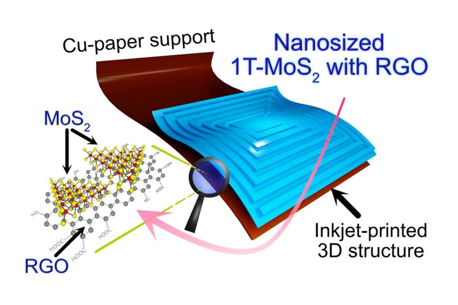 В Томском политехе создали такой катализатор из (MoS2) и графенового материала совместно с немецкими и китайскими коллегами. Сначала исследователи изготовили специальные чернила, содержащие нанопластинки (MoS2) и частицы восстановленного оксида графена. Затем чернила наносились на электрод из медной пластинки с помощью струйной печати. Это позволяет формировать трехмерную пространственную структуру нанолистов дисульфида молибдена.
