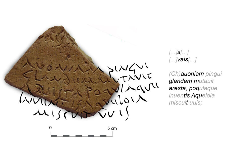 Однако отношение историков и археологов изменилось, когда они расшифровали надпись, которая не имела никакого отношения к хозяйственной маркировке: «S vais avoniam glandemm arestapoqv tisaqv it». Это цитата седьмого и восьмого стиха первой книги «Георгик», поэмы Вергилия, посвященной сельскому хозяйству и жизни в сельской местности, написанной в 29 г. до н.э. Полностью она должна выглядеть так: