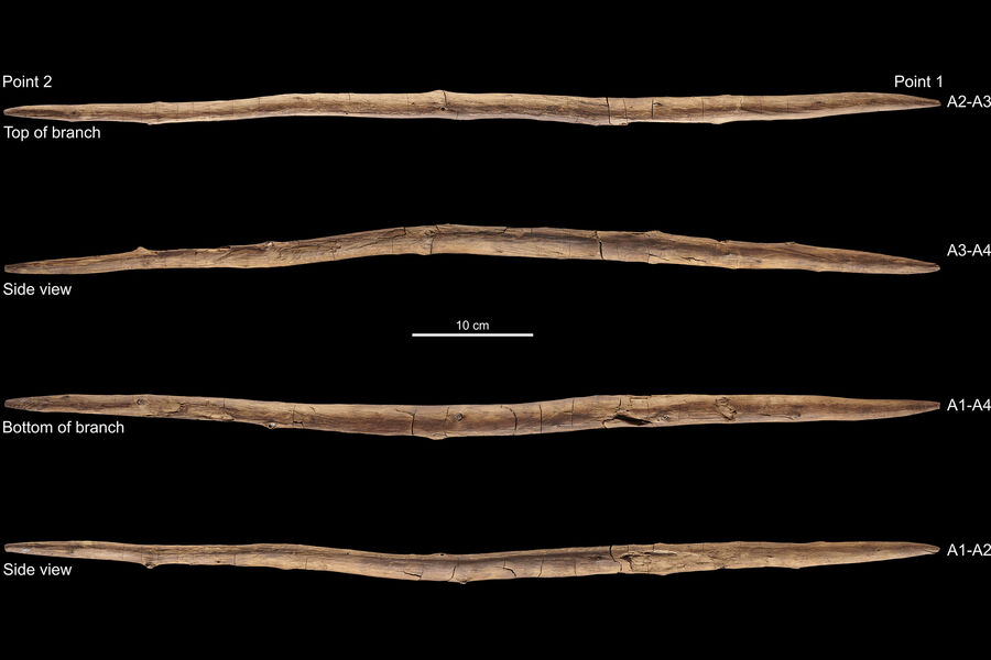 Находка была сделана в 1994 году в Шенингене — команда нашла несколько инструментов, возраст которых составляет от 337 000 до 300 000 лет. Среди прочего археологи обнаружили палку длиной 77 см. Долгое время было непонятно, что она собой представляет. Теперь специалисты изучили ее с помощью современных методов визуализации. Оказалось, что это — палка из ветки ели, заостренная с обоих концов, но один конец сужается намного стремительнее, чем другой. Авторы предположили, что палка была предназначена для метания как бумеранг.