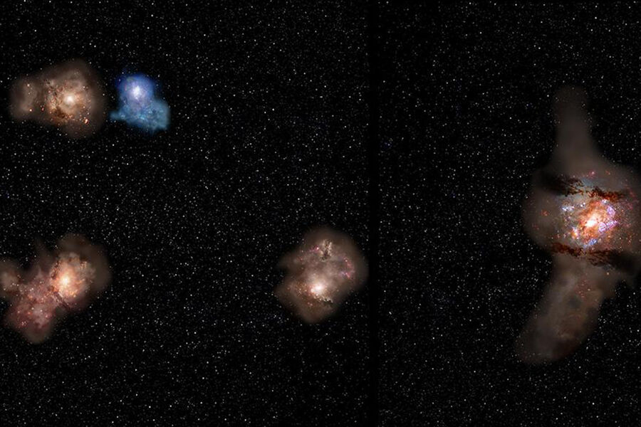 Ученые провели моделирование формирования галактик, чтобы теоретически проверить, как формировались и развивались четыре галактики в центральной области скопления. Результаты показали, что область плотных частиц газа возникла примерно через 680 млн лет после Большого взрыва.