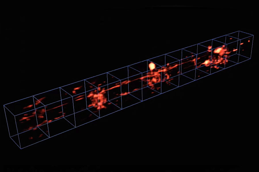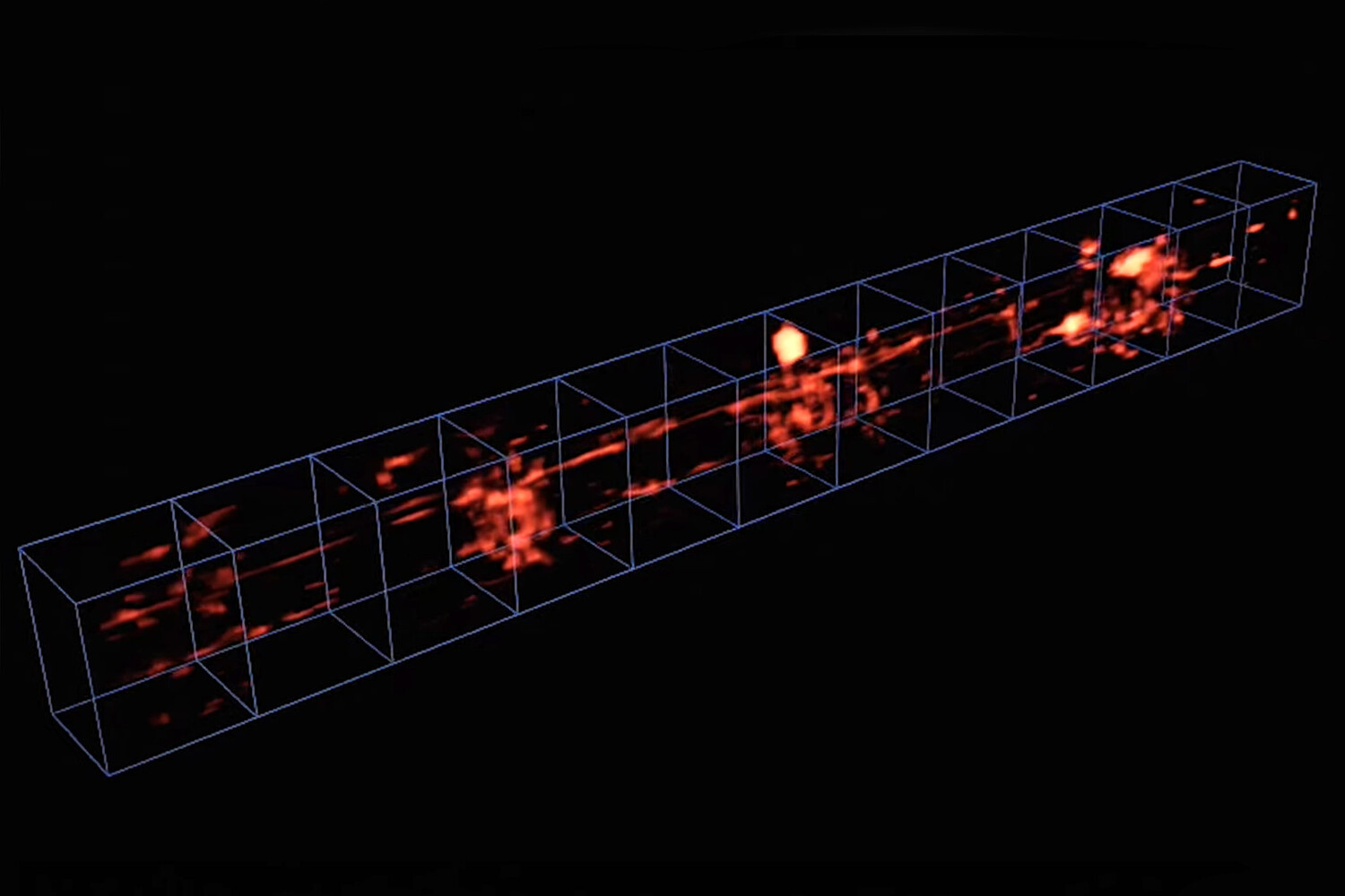 Согласно космологическому моделированию, более 60% водорода, образовавшегося в результате Большого взрыва примерно 13,8 млрд лет назад, сжалось, образовав слой, который затем распался и стал паутиной космических нитей. Эти нити соединяют галактики и питают их газом для роста и звездообразования.