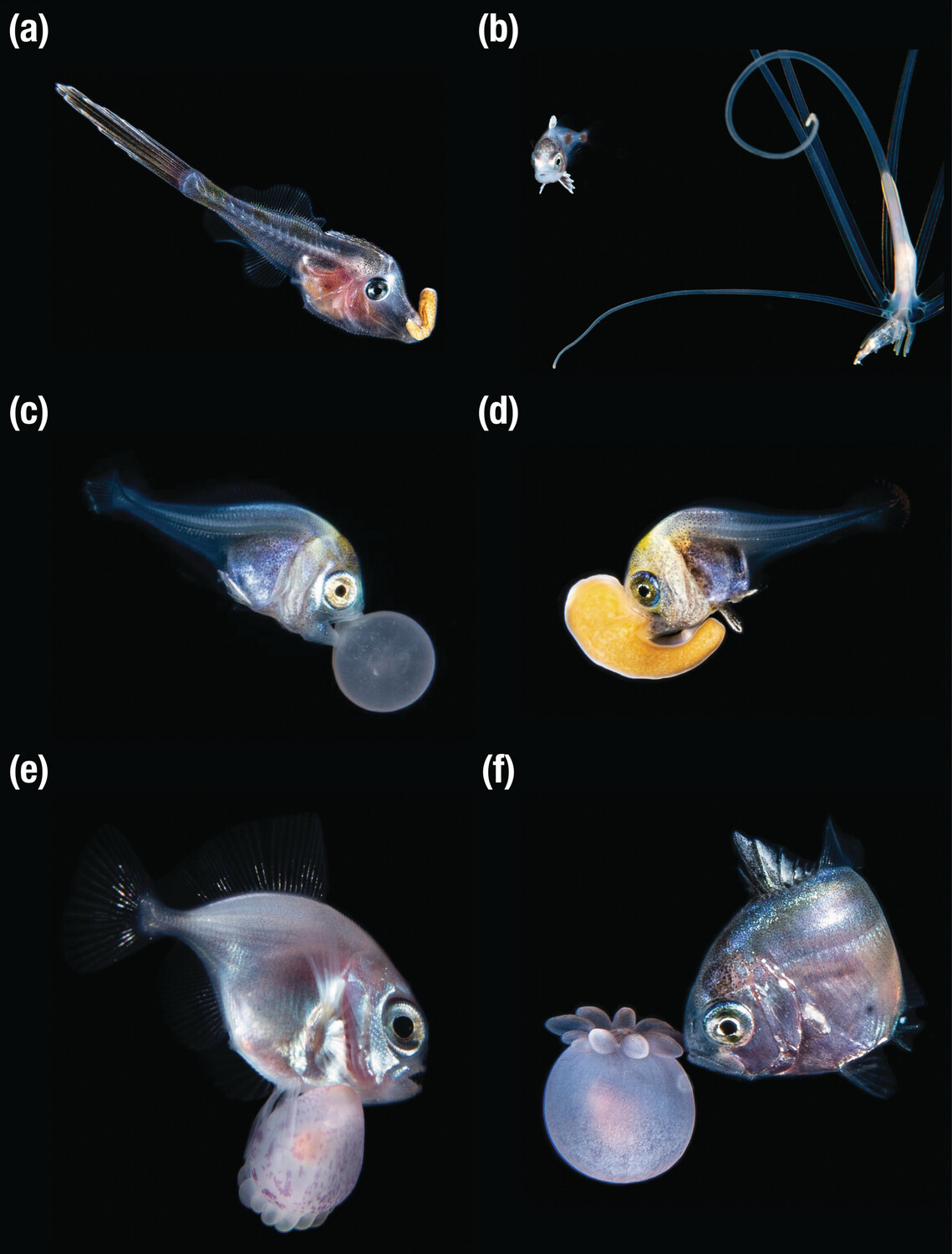 За ношением во рту личинок кораллов были застигнуты представители следующих семейств: ариомматовые (Ariommatidae), морские лещи (Bramidae), ставридовые (Carangidae) и единороговые (Monacanthidae). Они переносили личинок цериантарий из семейств Arachnactidae и Cerianthidae и зоантарий из семейства Sphenopidae.