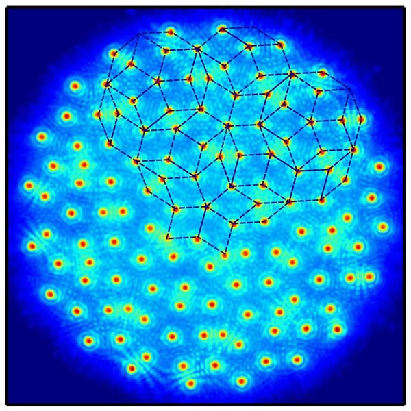 Для эксперимента ученые использовали экситон-поляритоны — гибридные квазичастицы, сочетающие свойства света и материи. С помощью оптических методов исследователи «напечатали» на полупроводниковом микрорезонаторе апериодическую мозаику Пенроуза — структуру, лишенную повторяющегося узора, но обладающую дальним порядком. При увеличении мощности лазера в узлах мозаики формировались поляритонные конденсаты, которые начинали взаимодействовать между собой.