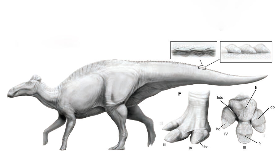 Окаменелости были обнаружены в американском штате Вайоминг. Ученые смогли восстановить подлинный облик кожи и конечностей древних рептилий. В результате удалось определить, что пальцы задних лап эдмонтозавра имели копыта.