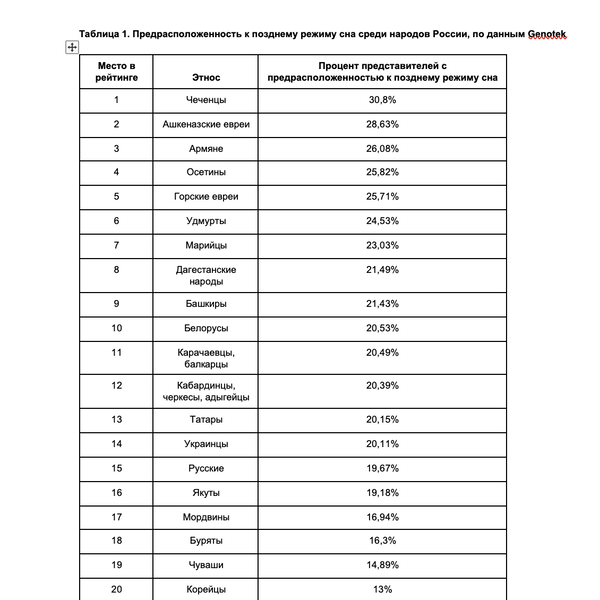Ученые проанализировали распространенность вариаций гена PER3 среди различных народов, эти вариации связаны со склонностью к определенному режиму сна. В результате было выявлено, что среди чеченцев (30,8%) чаще встречаются люди, предрасположенные к позднему режиму сна, на втором месте — ашкеназские евреи (28,63%), а на третьем — армяне (26,08%). Наименьшая доля «сов», склонных к поздним подъемам, наблюдается у азербайджанцев (12,21%), казахов (12,69%) и корейцев (13%).