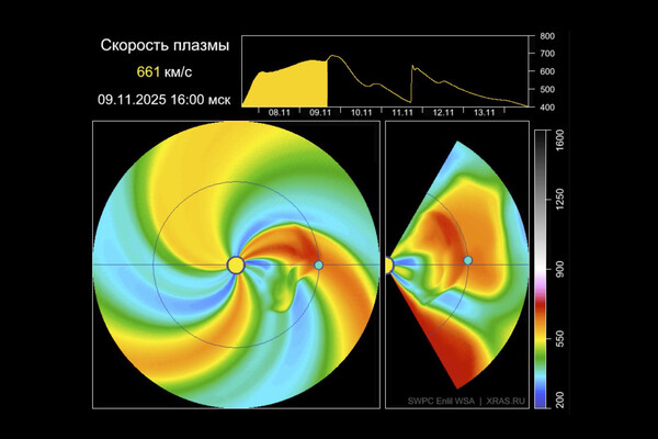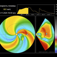 Там рассказали, что от первого выброса в первой половине дня 10 ноября ожидается средняя магнитная буря (уровня G2). Прилет от второго выброса прогнозируется поздно вечером 11 ноября. Его наиболее плотные части в момент отрыва от Солнца ушли севернее и должны пройти выше Земли.