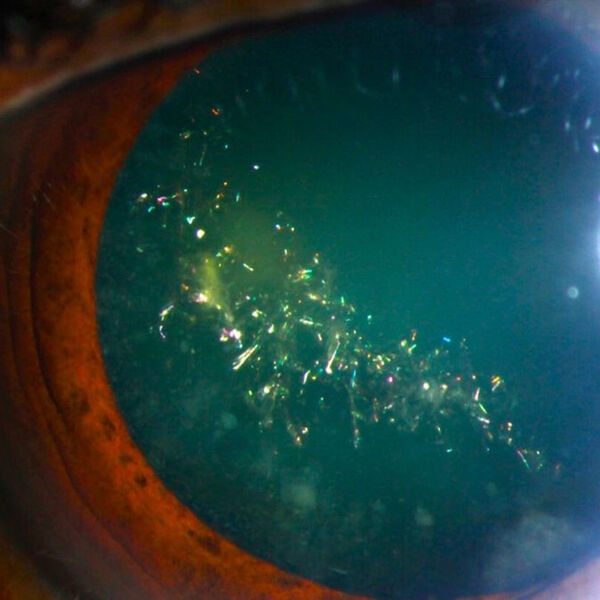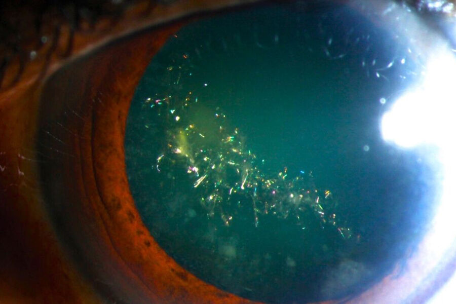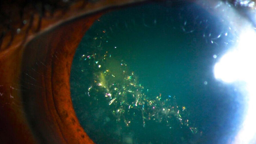Несмотря на эффектный внешний вид, речь идет о возрастном изменении. Такая катаракта возникает из-за накопления кальция в хрусталике, что ускоряет распад кристаллинов — белков, обеспечивающих его прозрачность. В результате образуется избыток аминокислоты цистина, которая кристаллизуется в виде тонких иглообразных структур. Именно они преломляют свет и создают «праздничное» сияние.