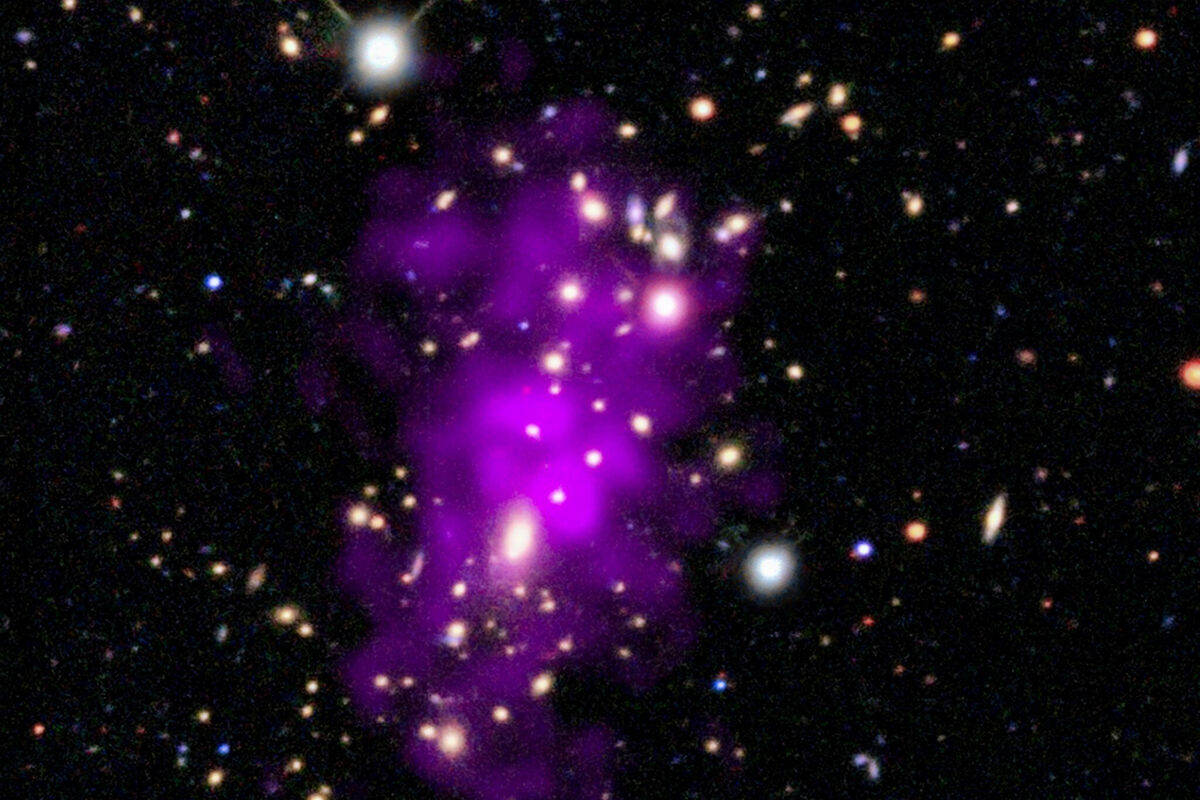 Рентгеновские наблюдения позволили увидеть сверхгорячий газ с температурой в миллионы градусов. Обычно такой газ в скоплениях галактик образует относительно округлые или овальные структуры, однако в данном случае он вытянут и распределен сверху вниз, что указывает на столкновение двух отдельных систем. В центральной области изображения различимы два сгущения галактик, соответствующие этим сталкивающимся скоплениям.