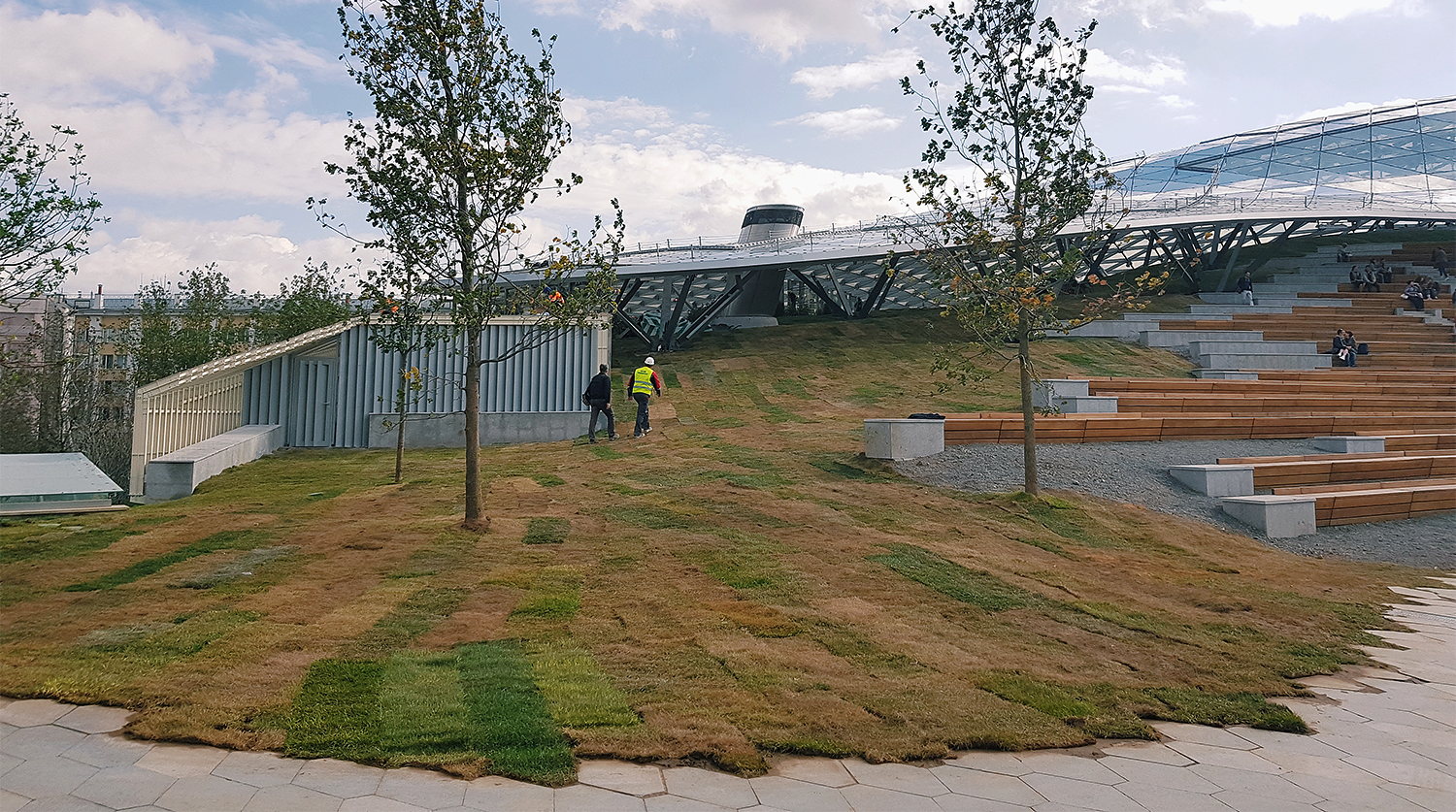 Печальнее всего выглядит газон: такое чувство, что он либо не рассчитан на такое число посетителей, либо, что вероятнее, был не очень качественно уложен изначально. По крайней мере, в Москве даже на «непосещаемых» участках нередко встречается именно такой лысеющий и успевший пожелтеть вариант покрытия.