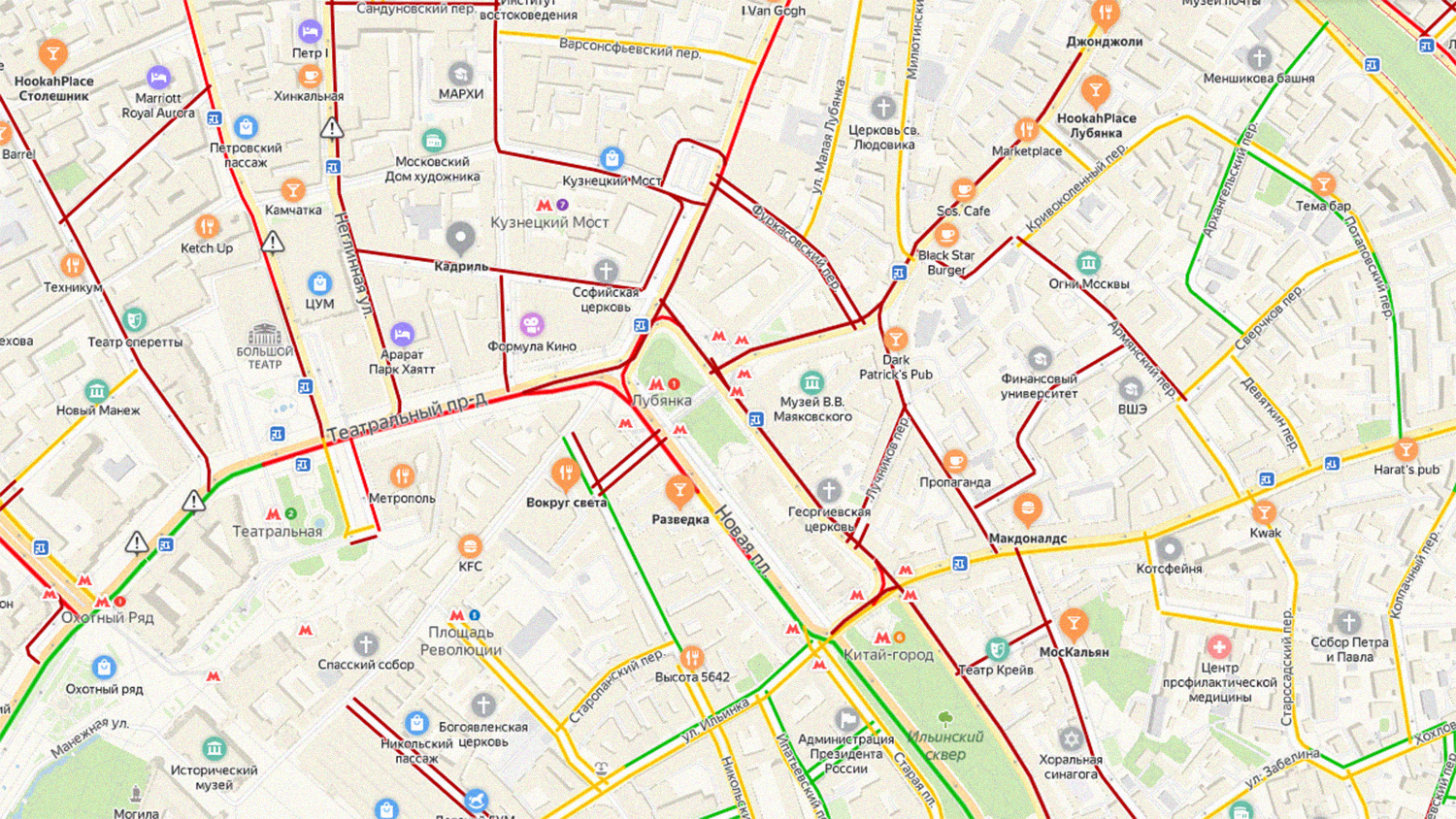«Яндекс.Карты»Движение в районе Большой Лубянки перекрыто. Выбирайте пути объезда.