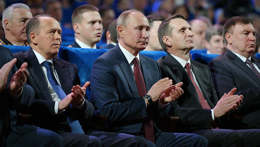 Директор Федеральной службы безопасности Александр Бортников, президент России Владимир Путин и директор Службы внешней разведки Сергей Нарышкин на торжественном вечере для сотрудников и ветеранов спецслужб, посвященном Дню работника органов безопасности России, 19 декабря 2019 года