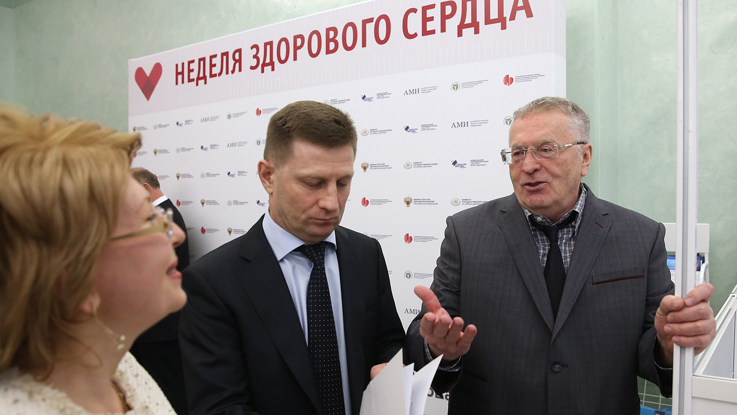Лидер ЛДПР Владимир Жириновский и член комитета Госдумы РФ по охране здоровья Сергей Фургал (справа налево) на открытии выставки «Неделя здорового сердца» в Государственной думе РФ, 2016