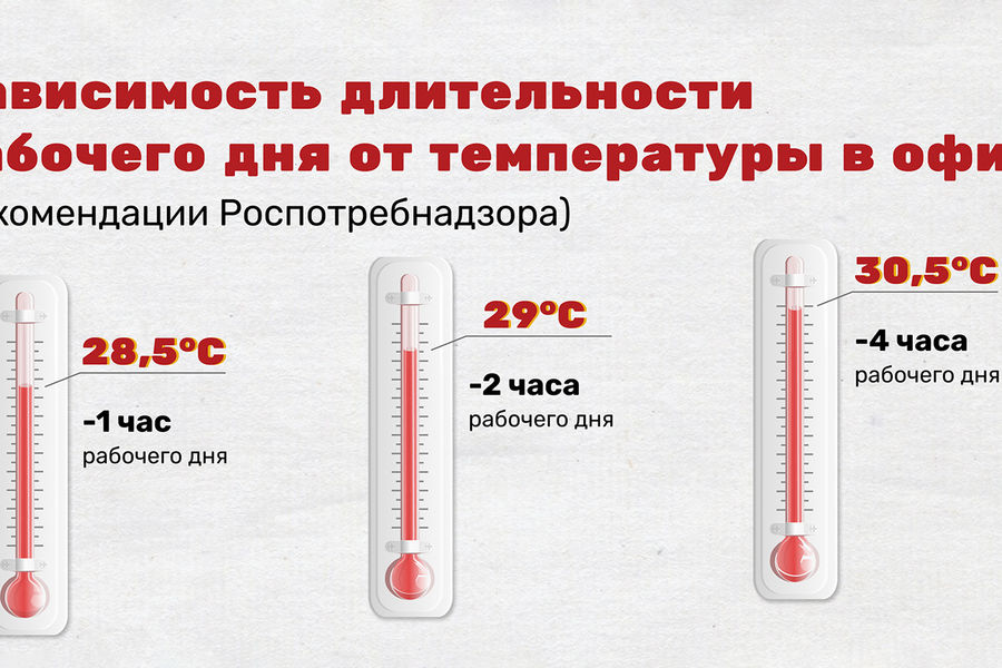 В случае достижения температуры воздуха в помещении отметки +28,5° рабочий день необходимо сокращать на час. Если показатели превышают +29°, то на два часа, при +30,5° — на четыре часа.
