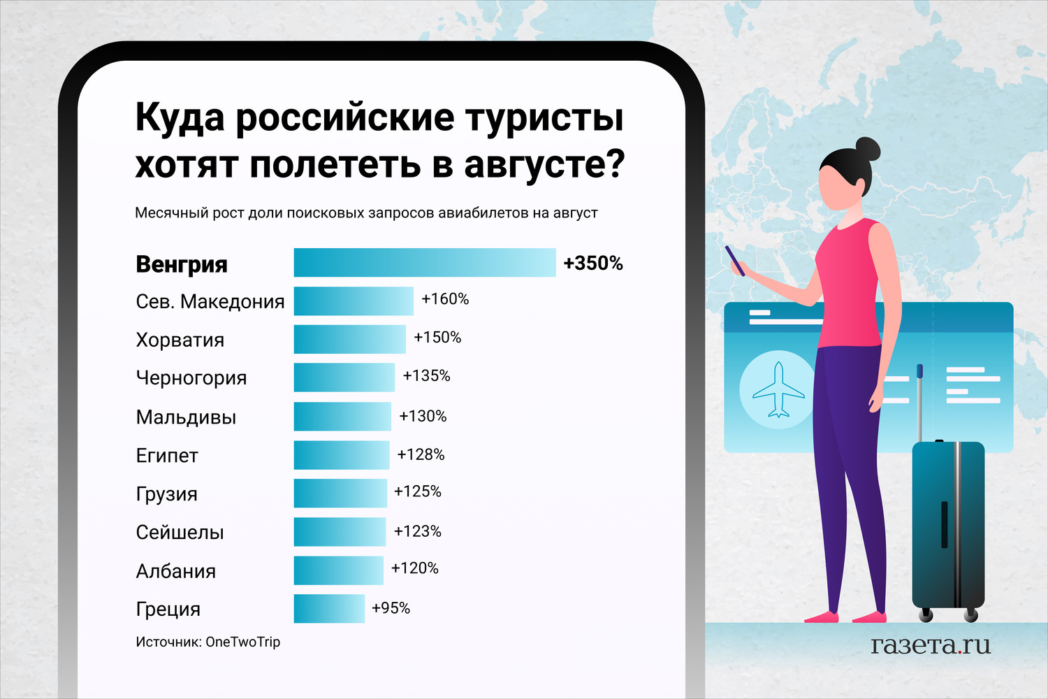 Аналитики сервиса планирования путешествий OneTwoTrip проанализировали совершенные в июле поисковые запросы на август и сравнили их с аналогичными данными по июлю. Исходя из исследования, туристы стали больше интересоваться полетами в Венгрию – доля поисковых запросов по этому направлению выросла на 350%. Всплеск интереса связан с новостями о том, что с 27 июля страна открыла границы для привитых туристов из России, предполагают в сервисе. Для посещения необходимо предоставить действующую шенгенскую визу и документ о вакцинации любым российским препаратом.