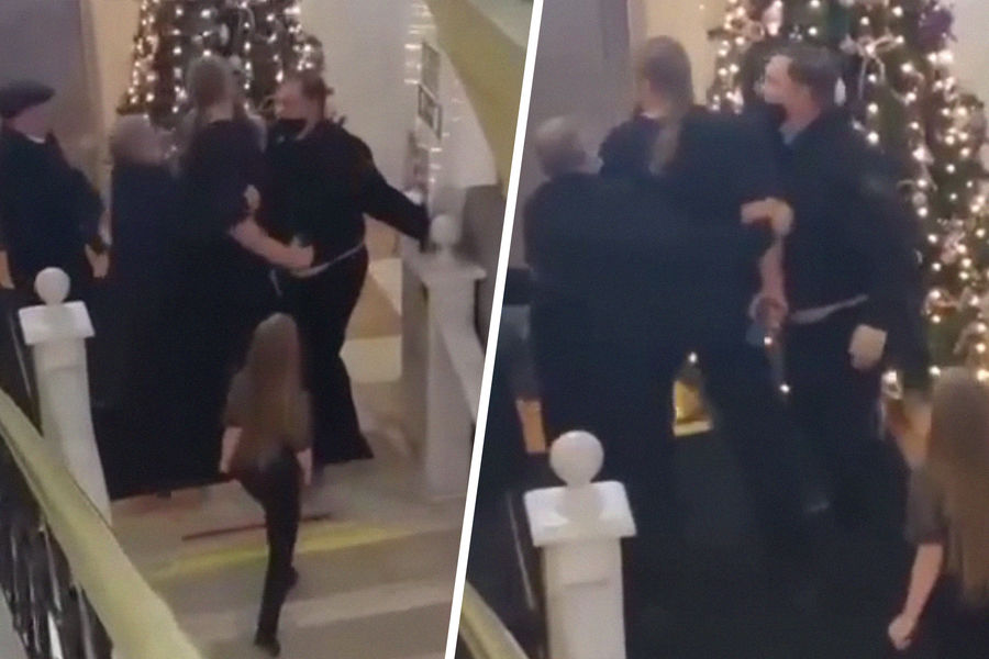Вскоре в СМИ появилось видео инцидента. На нем видно, как отец выкрикивает угрозы, хватает окружающих, толкается и рвется вглубь здания, а трое мужчин пытаются его остановить. Вся потасовка происходит на глазах у девятилетней Тепляковой.
