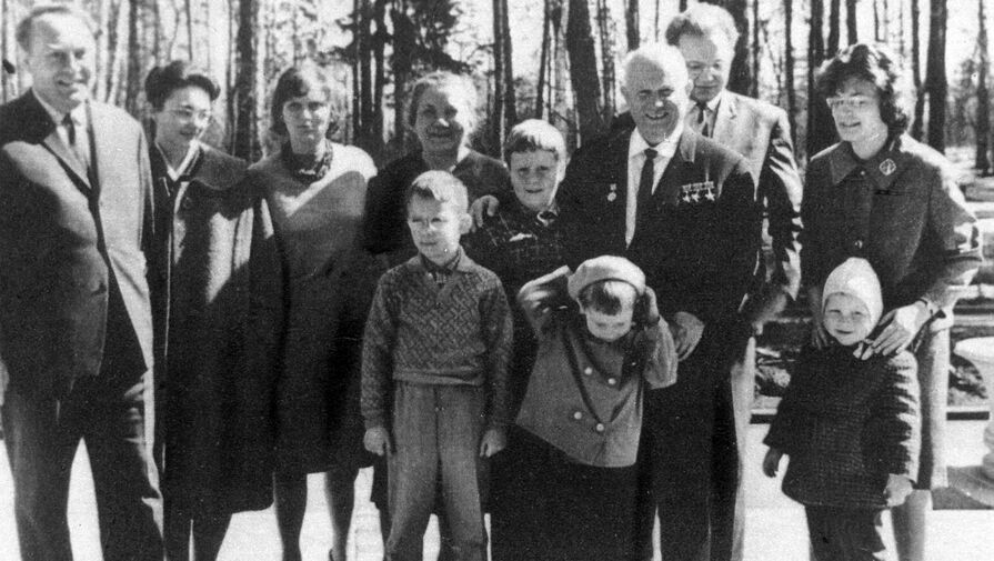 Семейный снимок семьи Никиты Хрущева (слева направо): Алексей Аджубей, дочери Хрущева Елена и Рада, жена Нина Петровна, внуки Алеша Никита и Ваня, Никита Хрущев, сын Сергей, невестка Галина, внук Никита, 1963 год