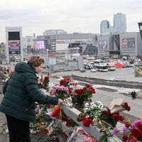 Женщина возлагает цветы у стихийного мемориала вдоль дороги у здания концертного зала «Крокус Сити Холл», 26 марта 2024 года