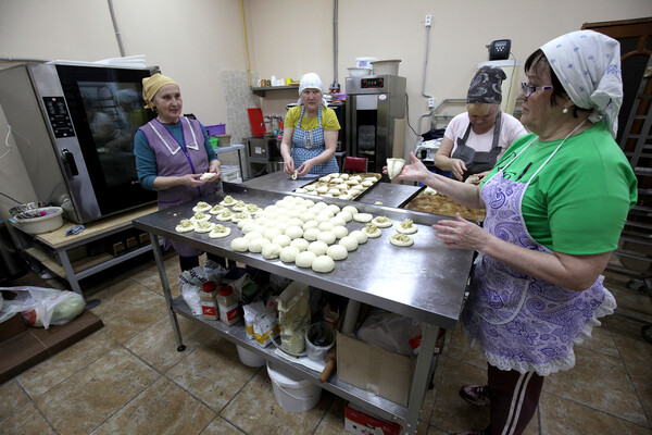 В соседнем помещении пахнет вкусными пирожками, женщины раскатывают тесто на металлическом столе. «Сегодня солдаты приедут, это им нагрузка в дорогу. Пироги с повидлом, с картошкой, но в основном — с мясом».