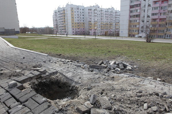 Мы проходим мимо закрытого детского сада, выкрашенного в яркие, веселые цвета. «Сюда тоже прилет был», — показывает Ксения на детский сад. «А в прошлую пятницу утром прилетело в технический этаж стоящей рядом с моим домом 14-этажки. А у нас десять метров от угла до угла».