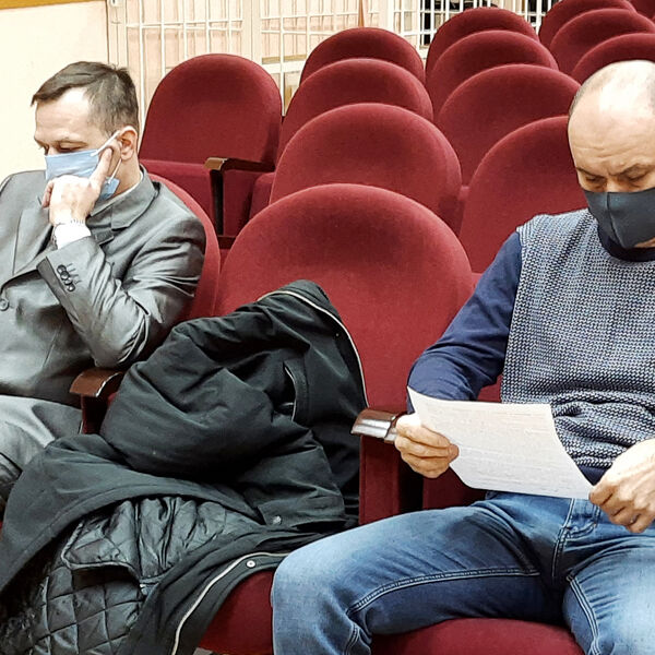 Полицейские Михаил Балашов и Дмитрий Тарицын (слева направо), обвиняемые в халатности, во время предварительного заседания в Ленинском районном суде, 2021 год