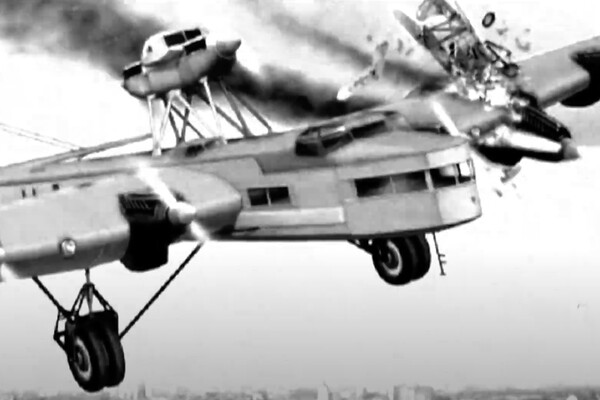Вдруг при попытке сделать «мертвую петлю» его истребитель завис в верхней точке… и рухнул прямо на крышу самолета-гиганта.