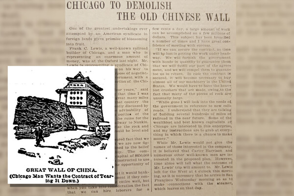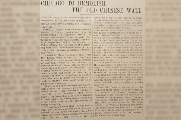 Некто Фрэнк С. Льюис из Чикаго якобы оказался в Денвере проездом, по пути в Китай. Представляя «чикагский синдикат капиталистов», он рассказал репортерам местных газет, что китайское правительство заинтересовано в сносе Великой Китайской стены, «отделяющей внутренний Китай от Китайской Тартарии».
