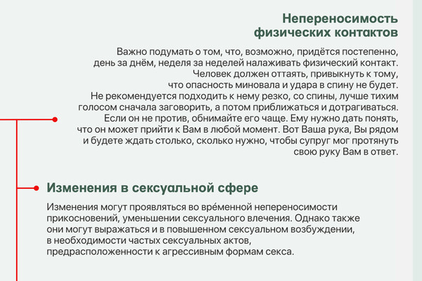 У вернувшихся с СВО бойцов могут появиться непереносимость физических контактов, тяга к спиртному, предрасположенность к агрессивным формам секса и «онемению чувств». По словам экспертов, в таких случаях следует обратиться к специалистам.