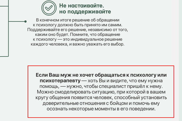 «Вашим мужьям потребовалось время, чтобы адаптироваться к военным условиям, и обратная адаптация к мирной жизни тоже не бывает быстрой <...>. Психике нужно проделать значительную работу, чтобы вновь повернуть на «мирные рельсы», — говорится в памятке, с которой ознакомилась «Газета».