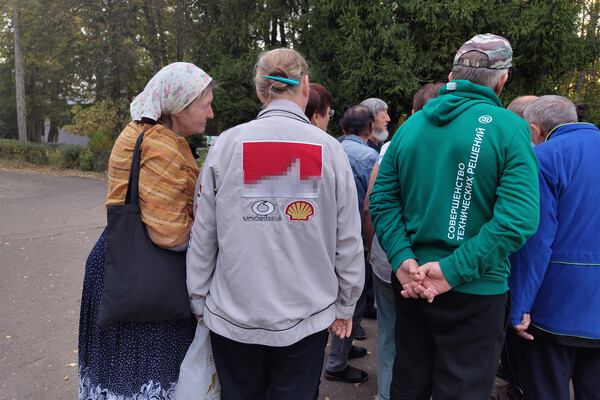 В толпе в основном пожилые женщины, кто-то привел с собой детей. Позади всех застенчиво и с любопытством выглядывают совсем старенькие бабушки в простой сельской одежде: ярких цветастых платьях-халатах и платках на голове. В моем детстве в курской деревне такие всегда сидели на лавочках у дворов.
