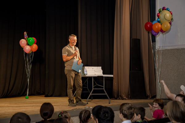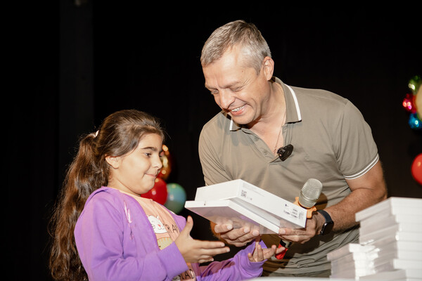 «Ситуация у нас, конечно, не очень хорошая. Можно сказать, очень непростая, тяжелая. Но благодаря определенным фондам и некоторым людям мы решили сделать для вас маленькое чудо, праздник и подарить вам планшеты», — выступает Богачев. Последние слова дети встречают аплодисментами и радостными криками.