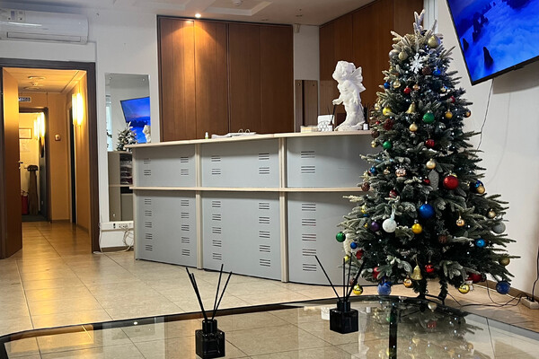 Никаких вывесок или указателей на здании нет. В фойе гостей встречает елка и кожаный диван. Единственное, что намекает на специфику организации — гипсовый купидон на стойке администратора.