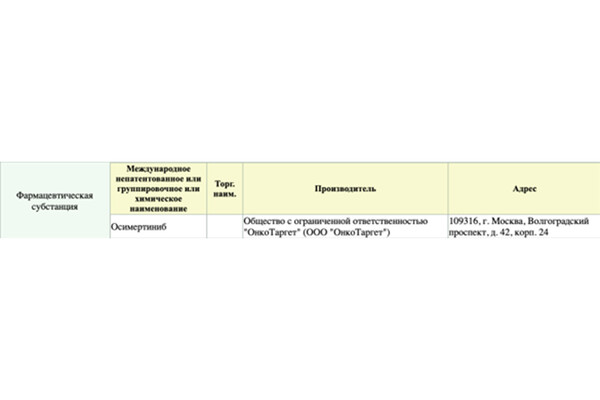 Однако это противоречит информации, которая отражается в Государственном реестре лекарственных средств. Здесь в качестве производителя действующего вещества — осимертиниба указаны швейцарские компании Доттикон Эксклюзив Синтезис АГ и Лонза АГ.