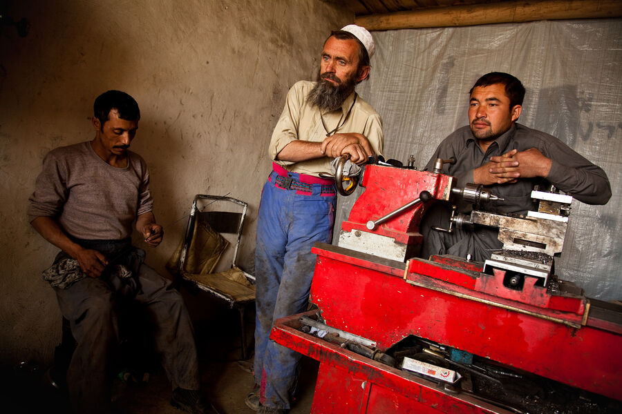 Сергей Красноперов (в центре) в своей мастерской в Афганистане, 2011 год
