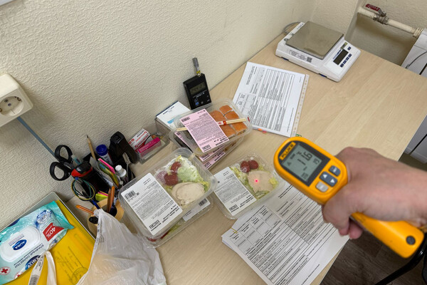 Первые нарушения были зафиксированы уже на этапе доставки: несмотря на +12°C на улице, курьер привез продукты, температурный режим хранения и реализации которых должен быть в пределах 4±2°С, без термосумки. Во время приемки образцов сотрудник института измерила температуру блюд — она превышала допустимую норму более чем в два раза.