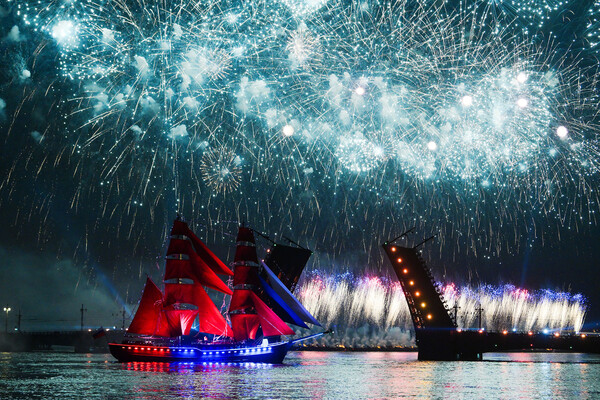 По окончании концерта после полуночи, около 0:40, по Неве торжественно пройдет бриг «Россия» под алыми парусами. Он символизирует галиот «Секрет», который ждала Ассоль в повести-феерии Александра Грина. В это время выпускники переместятся на Дворцовую и Адмиралтейскую набережные, чтобы насладиться красивым и торжественным зрелищем и пиротехническим шоу.