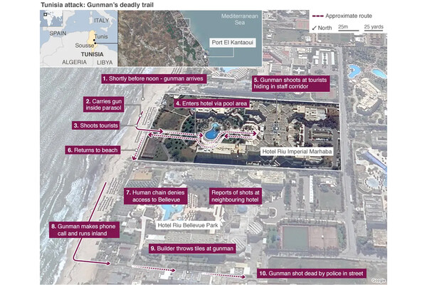 Расстреляв людей на пляже, Резги свободно прошел на территорию отеля. Обошел бассейн, заглянул внутрь комплекса, после чего вернулся к морю. Все это время террорист продолжал убивать, бросил несколько гранат, одну прямо в бассейн.