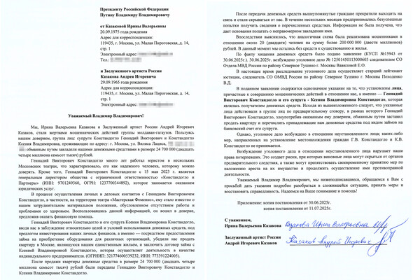 «Этого человека зовут Геннадий Констандогло. Он работал юристом на протяжение семи лет в московском театре «Мастерская П. Н. Фоменко», в котором я прослужил 30 лет. Он был не просто приятелем, а близким другом семьи. В какой-то момент ему стало известно о наших серьезных материальных трудностях, вызванных отсутствием работы и проблемами со здоровьем. Воспользовавшись этим, он уговорил меня с женой инвестировать в его бизнес — закупку театрального оборудования. Тем самым мы бы могли решить нашу финансовую проблему. Сначала он переводил нам денежные средства в течение нескольких месяцев, но потом стал пропадать, пока не признался, что денег нет», — рассказал свою историю заслуженный артист России Андрей Казаков, который сейчас работает во МХАТе им. Горького, а также задействован в спектаклях Центра драматургии и режиссуры. Казаков также известен зрителям по сериалам «Чернобыль», «Папины дочки», «Счастливы вместе», «Склифосовский», «Ищейка», «Монтекристо» и другим.
