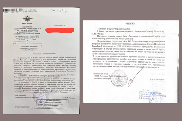 Карапетян в свою очередь опубликовал фотографию уведомления от регионального управления МВД, датированного 28 апреля, в котором сказано, что он больше «не является гражданином Российской Федерации». Основанием для такого решения стало «совершение действий, создающих угрозу национальной безопасности РФ», говорится в документе.