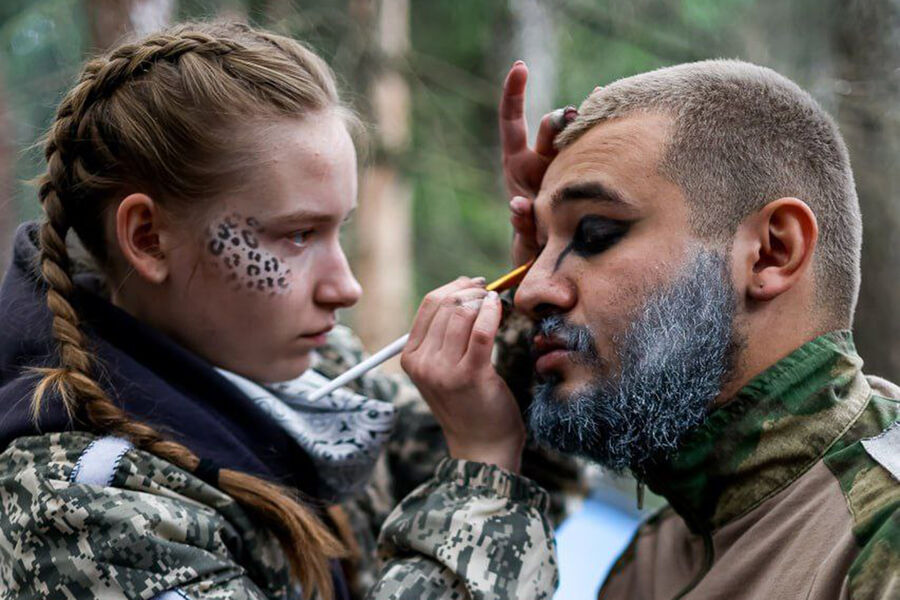 Участник военно-ролевой игры «Лес» наносит макияж