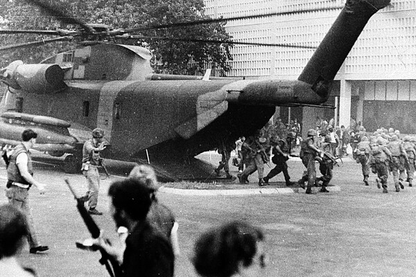 Это Южный Вьетнам, 29 апреля 1975 года, накануне падения Сайгона. Хаотичное отступление последних американцев как символ краха США в этой стране было описано итальянским журналистом Тицианом Терцани. Он же рассказал о знакомой картине массовых и бессмысленных грабежей на улицах: